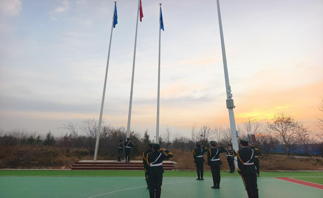 仪式由25工程造价1班王溢苒同学主持。晨光中,擎旗手25城轨信号班李丽珍与护旗手25机械制造班黄浩然、韩俊杰迈着铿锵步伐护送国旗入场,指挥手25人工智能2班谢伊代·买买提吐尔逊和25无人机2班王杨怡带领全场肃立。在雄壮的国歌声中,鲜艳的五星红旗冉冉升起,全体师生庄严肃立,行注目礼,表达对祖国的深切热爱与崇高敬意。