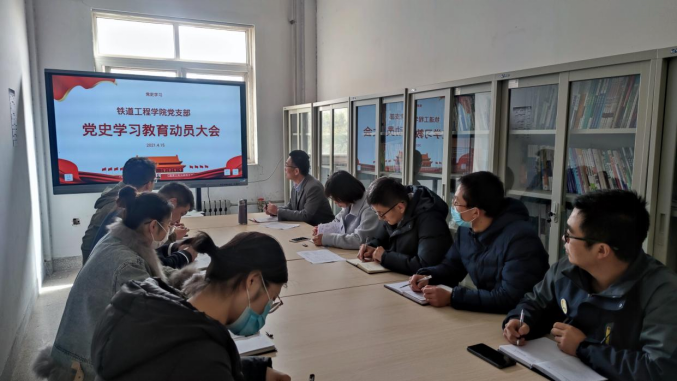 4月15日下午,铁道工程公司党支部在建筑楼会议室召开党史学习教育动员大会,会议深入学习贯彻习近平总书记在党史学习教育动员大会上的重要讲话精神,传达中央决策部署,省委、省委教育工委、公司党委工作要求,动员部署铁道工程公司党支部党史学习教育工作。党支部书记贾九荣主持会议,并作动员讲话,党支部全体党员参加会议。