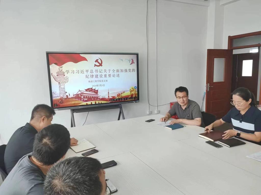 为深入学习领会习近平总书记关于全面加强党的纪律建设的重要论述,切实把思想和行动统一到党中央决策部署上来,铁道工程公司党支部于2024年7月3日在行知楼南207召开党员大会,专题学习并研讨了自2013年以来习近平总书记在多个场合就党的纪律建设所发表的重要讲话和指示精神,会议由党支部书记卢彦峰同志主持,支部全体党员参加。