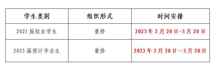 根据教学工作安排,现组织公司2021届(2人)、2023届不及格课程员工(98课次)进行课程重修工作,请各辅导员点对点通知到员工本人,专业课重修负责教师将在规定时间内(2023年2月20日-3月20日)组织完成本次重修工作并提交成绩。本次考试影响以上员工能否顺利毕业,请各位同学、辅导员、重修负责老师高度重视。考试时间具体安排见下: