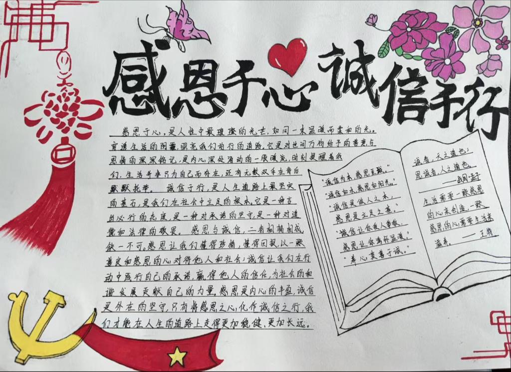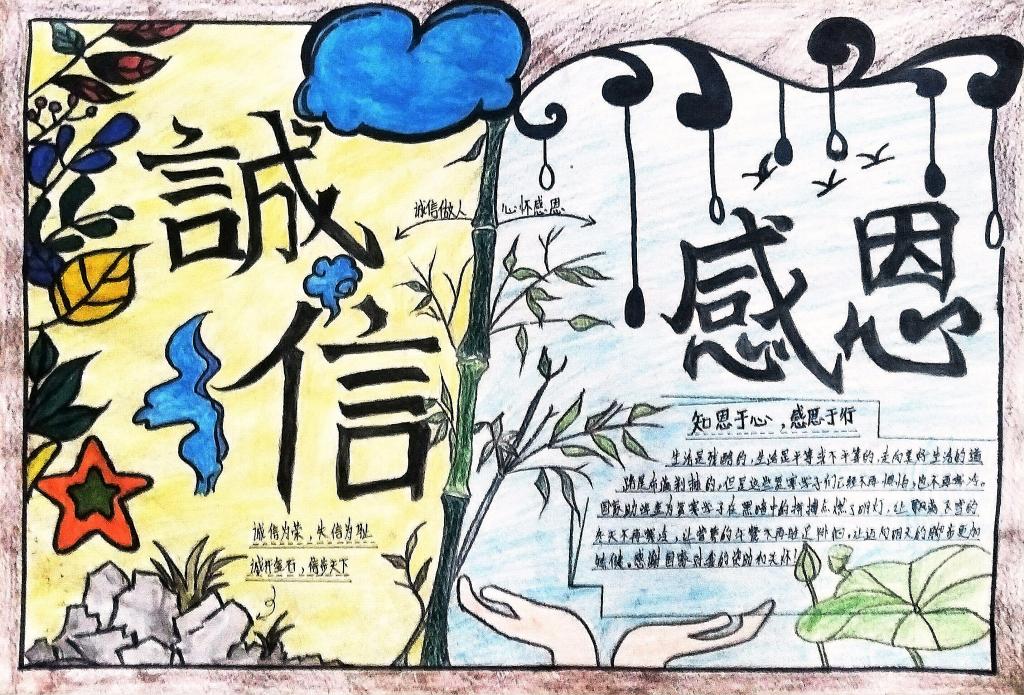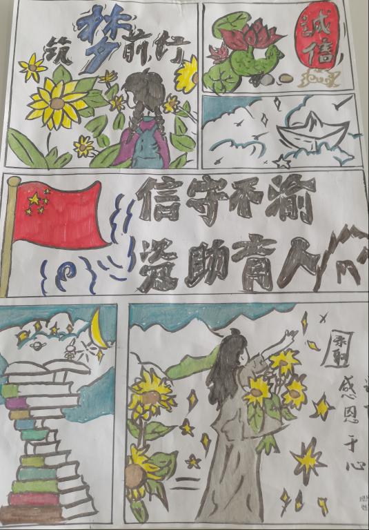 本次活动的作品,同学们凭借巧妙的创意、细腻的笔触和真挚的情感,生动展现出对国家资助的感恩与回馈,通过丰富的色彩、生动的画面和深刻的内涵,将感恩与诚信的正能量传递给每一位观者,这些作品如同温暖的溪流,缓缓流淌出同学们内心深处的感激。
